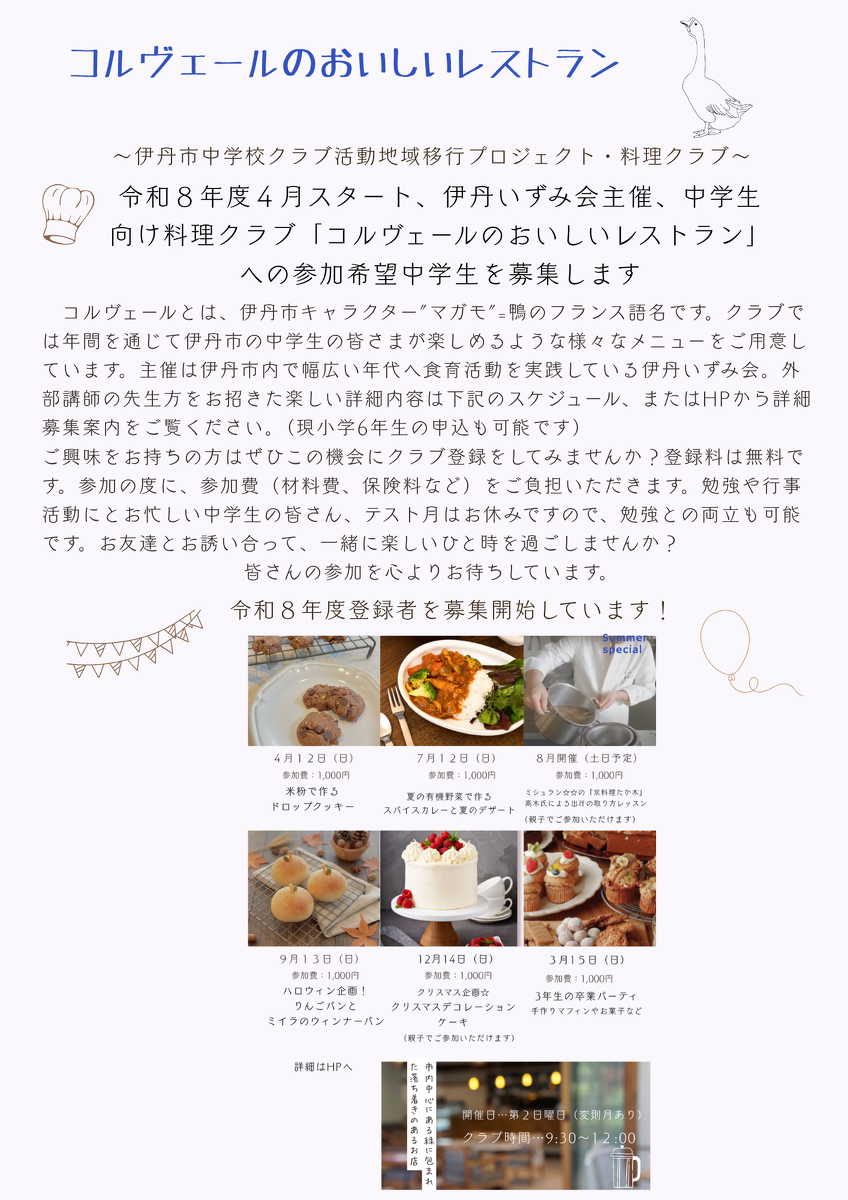 コルヴェールのおいしいレストランでは、調理を通して食について学び、皆さんと楽しいひと時を過ごすことを目的としています。主催は県・市内での歴史ある食育推進活動団体・伊丹いずみ会です。毎月様々な講師をお招きし、お菓子、パン作り~和洋食と様々なメニューをご紹介するのでお楽しみに!楽しく優しい講師の先生方、いずみ会リーダーさん達と、クッキングを通じて食を学び、楽しいほっとする時間を過ごしませんか?初めてでも大歓迎!実施月は年6回、テスト実施月はお休みなので勉強や行事にと忙しい皆さんにピッタリです。1回だけ、好きなメニューの回だけの参加も大丈夫。お友達とお誘い合ってご参加下さいね。皆さんのご参加をレストランでお待ちしています!