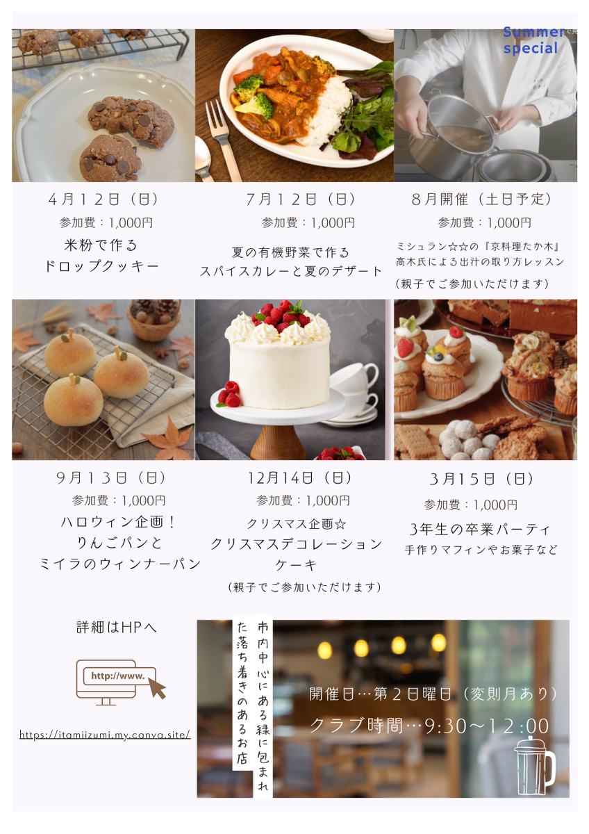 登録料:無料 参加費用:1,000円/回(材料費、保険料など) |