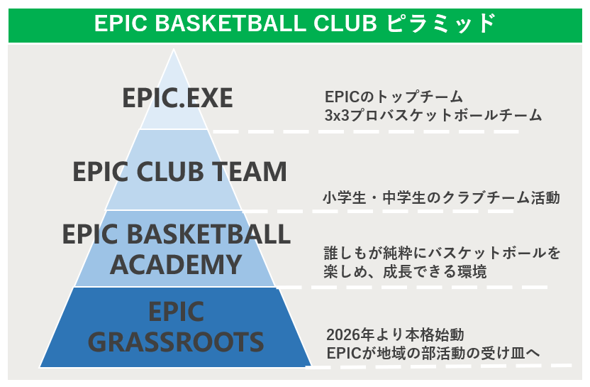 EPIC ITAMI GRASSROOTSは、3x3プロバスケットボールチームであるEPIC.EXEをトップチームとするEPIC BASKETBALL CLUBが担うチームです。
