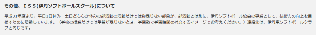伊丹東ソフトボールクラブなどの地域展開のクラブ活動だけでは、練習が少ないと感じたとき、授業の塾と同じように、補充して練習するための協会の技術力向上講座です。現在も伊丹市立東中学校や南中学校のソフトボール部に在籍しながら、重ねて参加している生徒が多く在籍しています。そのISSを伊丹市の地域分担で発展させたのが、ISS東部とISS南部です。練習以外は、現在は伊丹市立東中学校と重なります。